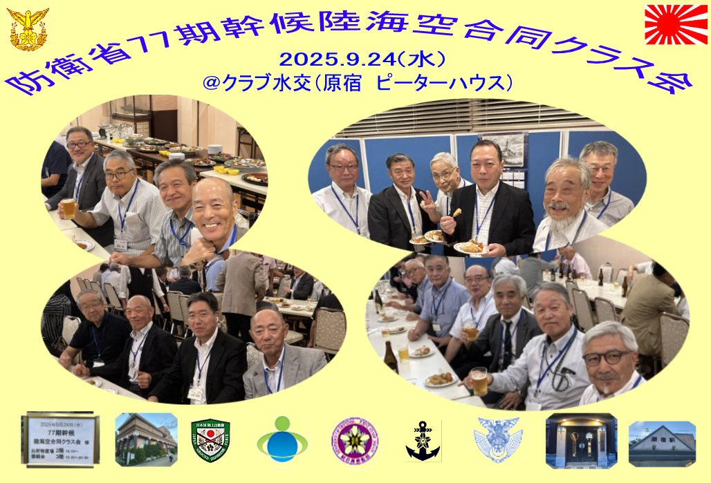 防衛省77期幹候陸海空合同クラス会 2025.09.25 2025/09/24にクラブ水交(原宿 ピーターハウス)で行いました。参加者は69名(陸39、海8、空19) 和歌山から木村雅人君・京都から山田正博君参加しました。 なお、黒川作成のHPは「http://navykuro.com/z108nda21/108nda21index.htm」変更しております。