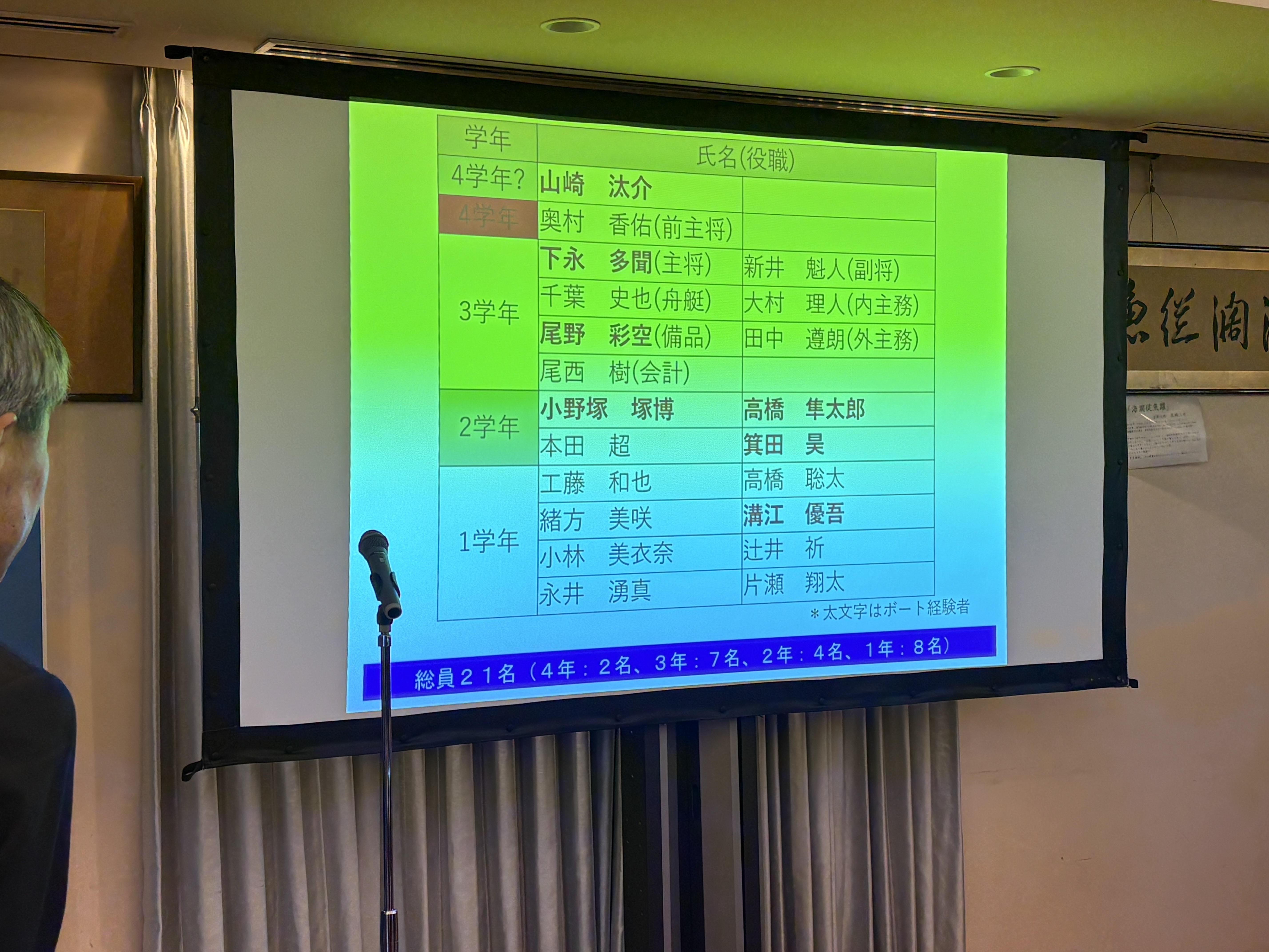2月28日(土)原宿のクラブ水交において艇友会総会が行われ、OB13名学生19名計32名が参加した。今年はOB参加も増え、走水でのコースタルローイングボートのデモ、宮ヶ瀬紅葉レガッタの学生オクトプルvs東海大かもめとのレースの動画、学生の活動状況の報告等充実した内容だった。ボート経験者は6名となり各期に1人以上いることになり今後の発展が楽しみだ。懇親会では4.25(土)五大学レガッタに出る、8+、W1Xのクルー、コースタル艇の今後レースへの参加、レース動画のOBへの発信等が話題になり、学生の熱意が感じられ大いに盛り上がった。山中会長から、卒業生の艇友会への入会、3種の儀、春合宿、新入生歓迎支援金の贈呈を行い、中畑艇友会会長、山中監督の新たな体制のもと、防大ボート部、艇友会の更なる進展を期待したい。