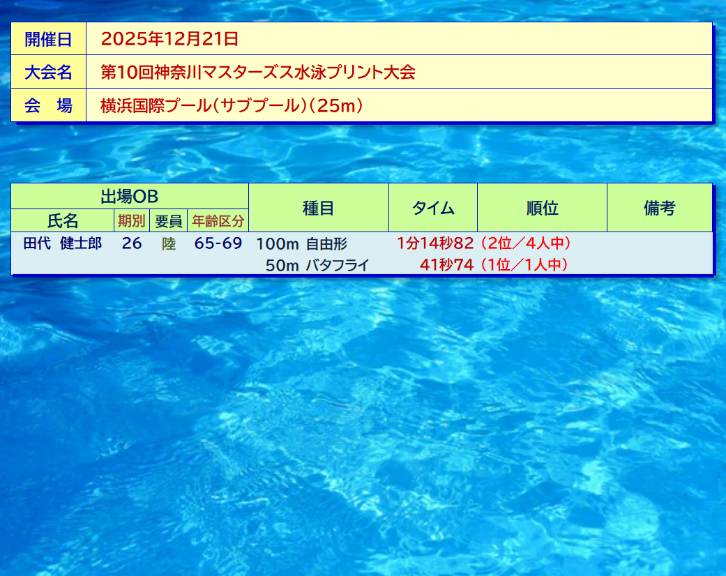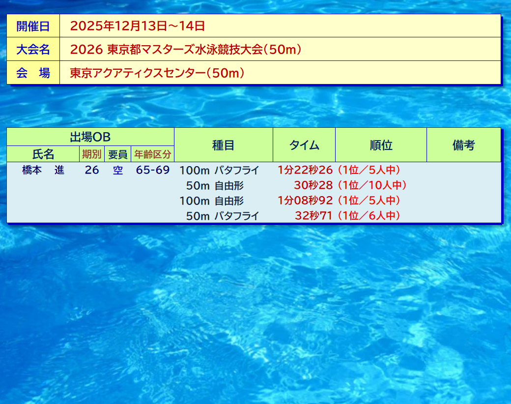 | 12/13~14 | 2025年度 東京都マスターズ水泳競技大会(50m) |