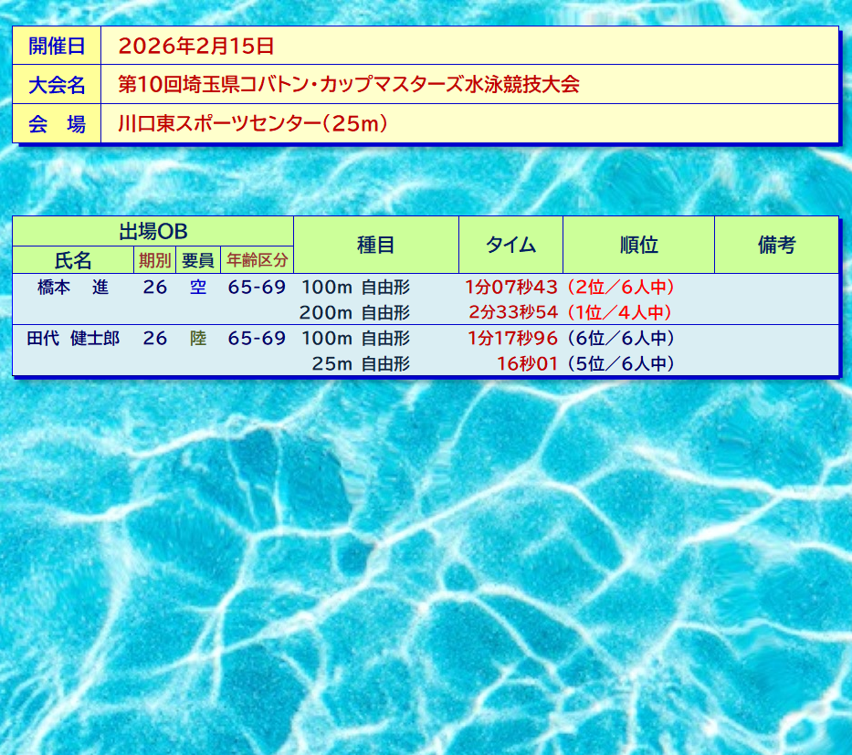| 2/15 | 第10回埼玉県コバトン・カップマスターズ水泳競技大会 |