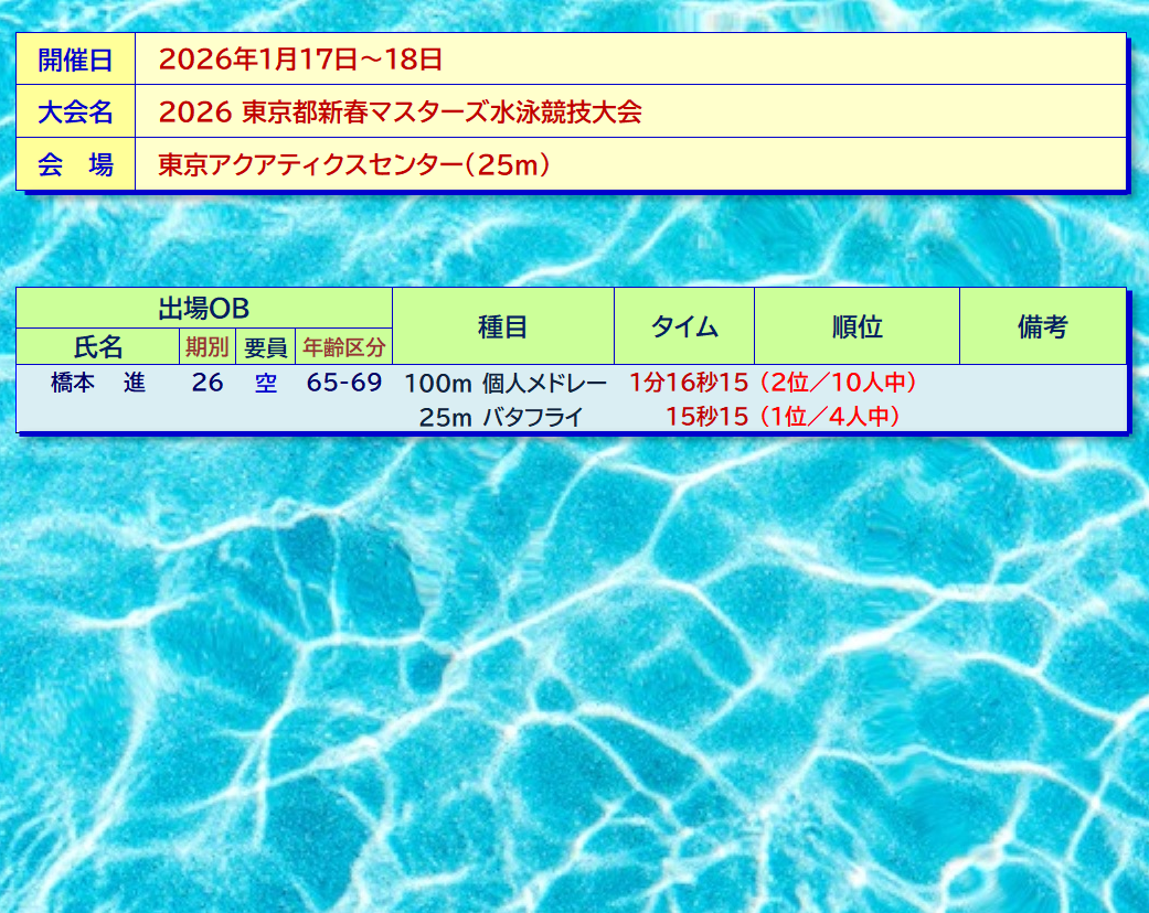 | 1/17~18 | 2026 東京都新春マスターズ水泳競技大会 |