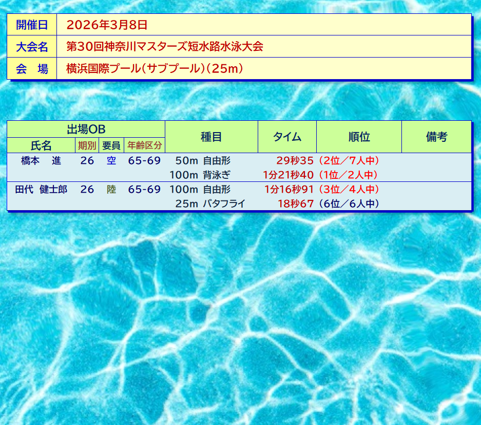| 3/11 | 第22回 神奈川マスターズ短水路水泳大会 |