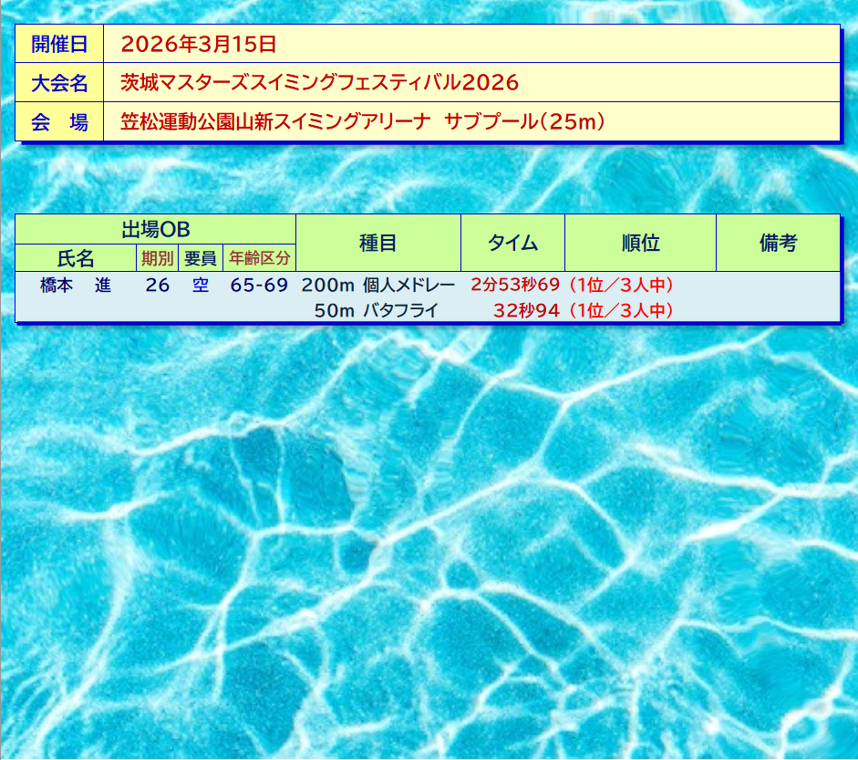 | 3/15 | 茨城マスターズスイミングフェスティバル2026 |